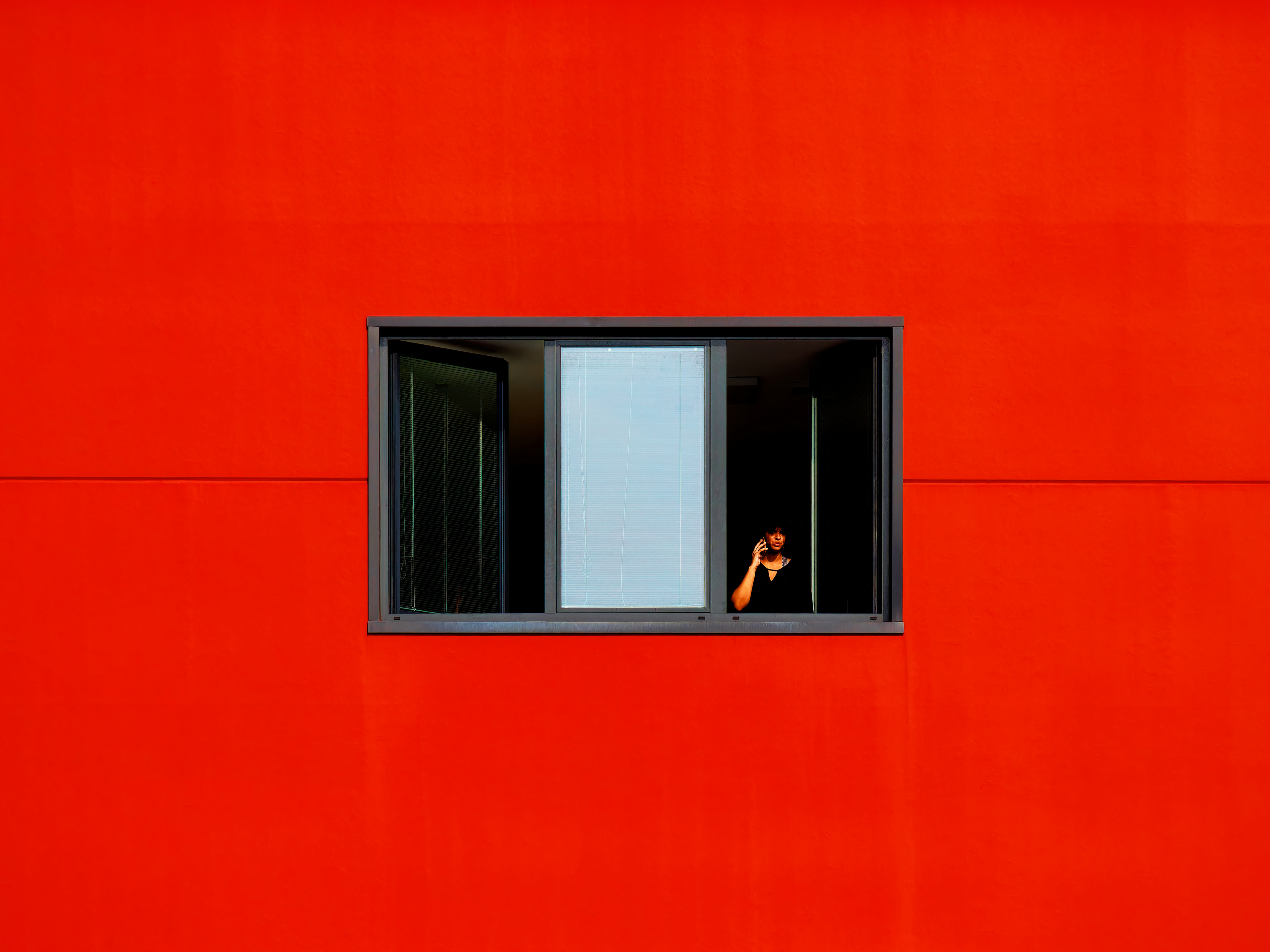 One of my favourite photos from last year is titled "a call in the matrix". While attending a conference in Venice, I roamed the streets of Mestre with my camera. A big red façade with one-two windows caught my attention. Positioned about 100-200 meters away, I captured a shot with the 100mm focal length. Beyond the window, a woman spoke on the phone, moving around the room. Patiently waiting, I hoped she would align with one of the open spots in the frame. After a few minutes, she did, and I captured the shot.